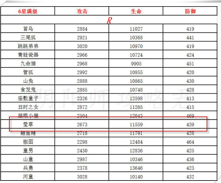 阴阳师手游六星萤草满级属性一览