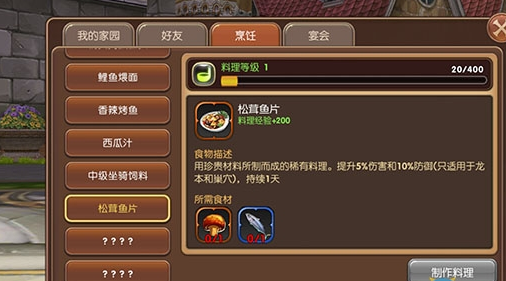 烹饪就是指在家园中所种植的与钓鱼系统所收获的材料将可以在烹饪栏里进行烹饪,烹饪不仅仅增加自己的料理等级。更重要的是烹饪出的食材能给自己增加大量的有益BUFF。不同的食材能增加不同的活动中所给予的增益BUFF。(包括巢穴、副本、女神之泪、BOSSRUSH、多人深渊等等一系列的加成)拿上图所比方松茸鱼片所带给的增益是提升5%伤害和10%防御(只使用于龙本和巢穴)持续一天。