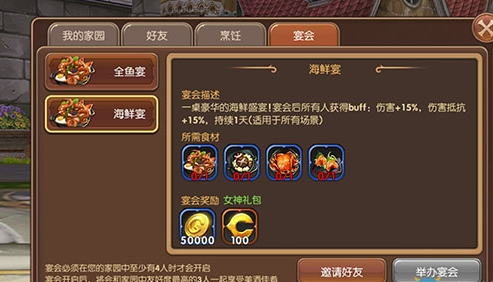 龙之谷手游还推出了新的多人活动玩法宴会。宴会仅限于在家园中有四个或四个以上的队友才能开启。宴会开启后将会和友好度最高的三人一起享受美味佳肴。并且给大家看看宴会的增益BUFF一桌豪华的海鲜盛宴,宴会后所有人获得BUFF,伤害+15%,伤害抵抗+15%(适用于任何场景,持续一天)大家看到这个是不是感觉惊呆了?当然除了海鲜宴还有全鱼宴,这两者不可叠加。但是都是属于逆天BUFF系列。可以毫不吹嘘的说,家园里所有的料理叠加的话,攻击加成能轻松多出30%还有各种防御,抗性,等等之类的叠加。可以说大家对于刷图有问题的吃个料理,BOSSRUSS有问题的吃个料理,巢穴有问题的吃个料理。总之在手游龙之谷中没有什么是吃完料理后过不了的图,如果有那就多吃几个