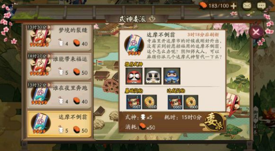 寺庙里开达摩布的时候我刚好外出,没有买到祈愿招福用的达摩不倒翁,这个怎么办呢?阴阳师大人,可以麻烦你派几个达摩式神暂代一下么?