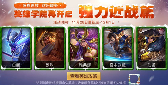 感恩再续,学院开启!使用指定近战英雄完成任务可收集暖冬雪球,兑换暖冬头像框等好礼!