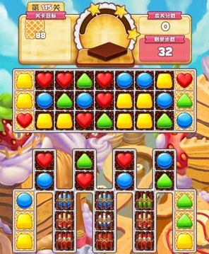 碎碎曲奇115关3星攻略,碎碎曲奇115关怎么过?第115关难度在于上下分层交错比较乱,好处是下方有特殊曲奇,只要从上面成功地合出一个竖条的给打下去,基本上就差不多了。