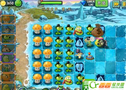 1、万众期待的第一关作为冰河世界的基础关卡,并没什么难度,初始是三阶僵尸,如果植物阶数不够的话建议多升级!没有什么难度可言。依旧用土豆雷战术!!