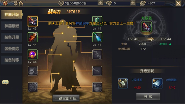 随着等级的提升,可以不断提升神器的等级,来可以提供战斗力。当装备升级到当前品阶的顶级时,需要使用精石和陨铁来升阶,第一次升阶需要是一级精石和陨铁,第二次升级需要是二级精石和陨铁,以此类推。这两种材料可通过日常副本或合成或宝库获得,多到宝库探索即可获得经验又可获得一些材料。