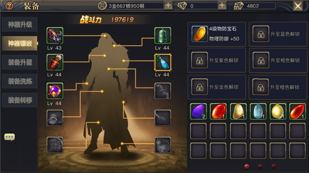 神器每完成一次升阶可获得1个镶嵌孔,每个镶嵌孔可镶嵌一颗宝石,有绿→蓝→紫→橙→金→红6等级。多个低等级宝石可通过合成高等级来镶嵌。