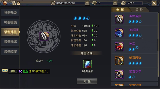 装备升星时会按装备的基础属性等比例提升一定属性。随着装备升星等级的提高,需要的升星石等级也随之增加。1级升星石来自大漠迷城、红尘历练;2级升星石是来自大漠迷城和物品合成。的升星石。