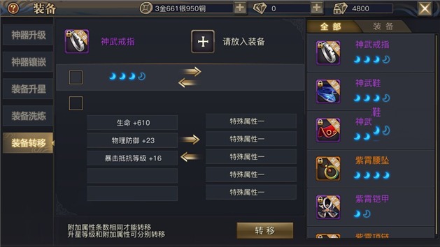 装备转移可将一件装备的附加属性和升星等级转移到另一件装备上,该功能主要用于在淘汰旧装备的时候,原有的升星等级和装备洗练好的属性可以得到保留。这个功能解决了装备上的浪费,不错。