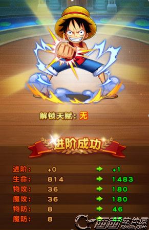 【橡皮之果】超人系恶魔果实,食用者的全身可像橡皮一样自由的伸缩!可利用弹力和斥力进行攻击以及高速移动,免疫麻痹、石化,自身伤害提高5%,生命50,伤害加成0.5%。