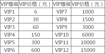 VIP各等级充值金额