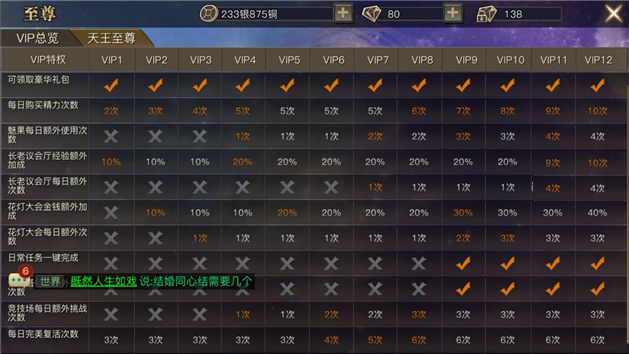特权:可领取至尊12豪华礼包、长老议会厅挑战次数增加2次、花灯大会额外获得40%银两、帮会捐献次数额外增加4次、竞技场挑战可购买次数增加4次、每日可额外购买精力9次