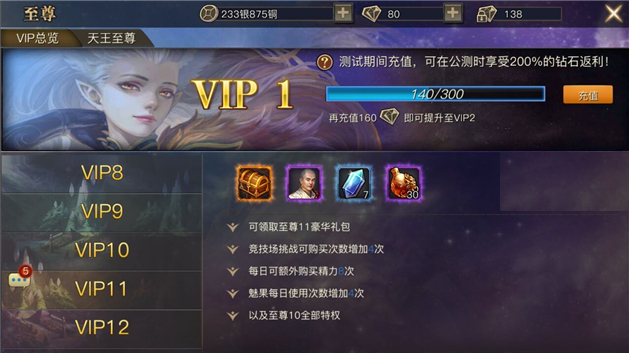 特权:可领取至尊8豪华礼包、镇妖塔挑战次数增加1次、每日可额外购买精力5次、点将台免费刷新次数增加2次、每日完美复活免费次数增加8次、每日赠送好友礼物上限增加4次以及至尊7全部特权