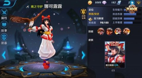 娜可露露是SNK正版授权的植入型英雄,是第二个带伙伴的英雄。娜可露露属于刺客,输出能力很强,同时机动性也是比较不错的,但因为这个英雄缺乏控制手段,所以在正面碰撞上会吃亏不少。在战场上娜可露露主要是在团队后方找准时机,利用远距离的飞鹰急袭直扑敌方后排英雄,趁着敌人还没采取有效反击之前瞬间将目标打爆。