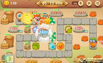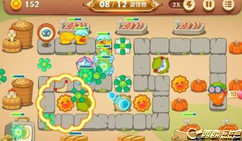 中期建造三个太阳花几乎全屏攻击。将冰冻星升到顶级降低怪物移动速度。风扇左右攻击可以趁着这个时候攻击道具获取部分金币建造其他的炮台。