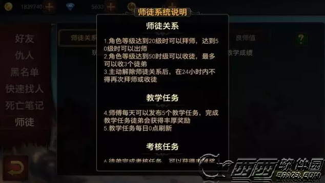 师徒教学:1、教学任务需要由师傅发布给徒弟,每天可以发布5个,同时徒弟还有固定的考核任务。2、 完成任务后,师傅可以获得教学成绩,徒弟可以获得丰厚的任务奖励。3、 徒弟出师时,师傅的教学成绩会转化为良师值,并且师徒都会获得丰厚的出师奖励。