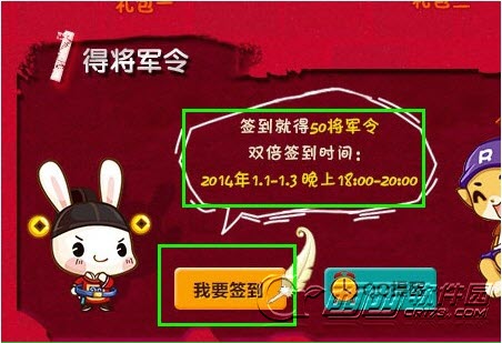 2、每日签到获得50将军令,2014.01.01-2014.01.03的晚上6-8点,是双倍签到时间,可以得到100将军令哦!