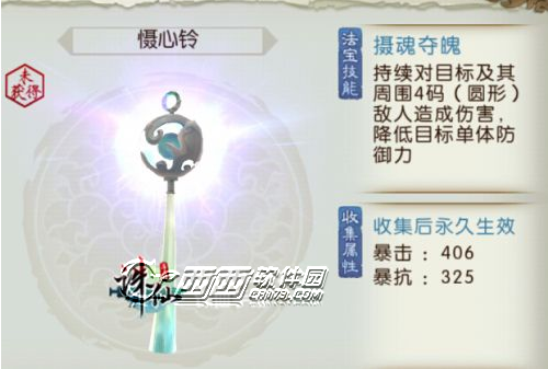 上图中我们可以看到该法宝的技能是可以降低单体敌方的防御,相信配合合欢的单体输出能力可以让伤害打出更高一波;此外慑心铃法宝的收集属性还可增加人物的暴击率,对于合欢来说想必也是比较需要的,而且该法宝入手难度比起其他法宝而言极为低,因此是最为推荐的。