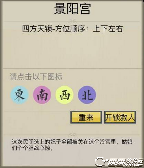 所谓江湖四方天锁是景阳宫的一个任务环节,需要按照游戏提示的方位顺序点击,那么具体怎么解锁呢?下面西西就来为大家分享所谓江湖四方天锁攻略,希望大家喜欢。