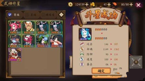 每次升星需要使用两个相同星级的式神作为祭品,毕竟是变强的代价呢,不过正因为这样,萌新们在获得新的式神后,要考虑如何合理地去使用自己麾下的式神。式神升星成功后,等级将会重置为1级,但是基础属性和成长值会稍稍增强,而且会加等级上限,每升1颗星会增加5个等级上限。就比如上图的青行灯,3星的时候等级上限为25级,而升到4星等级上限就会变为30级。