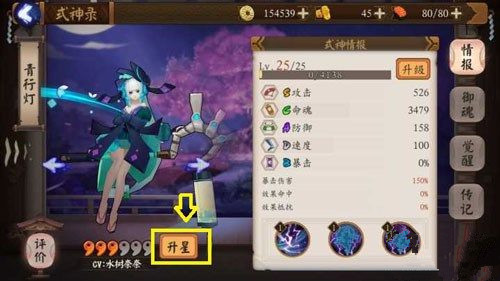 为了让我们的式神突破等级瓶颈,我们将会用到黄色箭头所指的功能,也就是升星功能,我们可以通过这个升星,给已经到达等级瓶颈的式神进行升星,但是没有达到等级瓶颈的式神却是不能够用升星这功能。通过升星这个功能,能使我们的式神变得更加强大