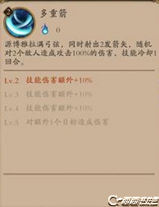 同时发出2发箭矢,随机对两个敌人造成100%的伤害,技能冷却1回合。