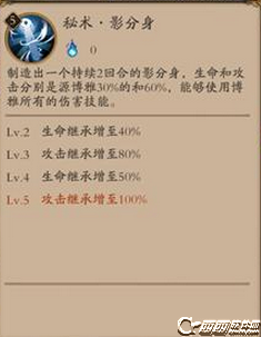 制造一个持续2回合的影分身,生命和攻击分别是源博雅的30%和60%,能够使用源博雅的所有伤害技能。这里要特别说明一下,影分身所能够使用的伤害技能,必须是源博雅已经携带了的技能。这也就意味着,源博雅除了要带一个影分身之外,还要带一个伤害技能,不然影分身就相当于一个只会普通攻击的白板。然而因为阴阳师除了普攻只能携带2个技能的限制,携带伤害技能意味着无法携带【秘术·豹眼】,这对队伍来说是相当不划算的,因为一个分身的输出毕竟比不上全体式神的输出。所以此技能基本上是个废技能,不作考虑。