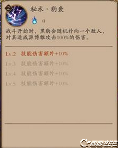 增加己方全体15%的暴击伤害,持续2回合。拥有该增益效果的对有进行攻击时,黑豹有30%的概率对随即一个敌人释放【秘术·穷追】。源博雅唯一的一个辅助技能,增加暴击伤害的效果配合暴击高的式神能提高不少的输出。