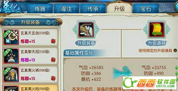 真仙装备升级后,基础属性大幅提升,炼器等级加成按新的装备等级为基础,计算炼器属性加成数值。