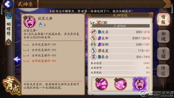 祈愿之舞,消耗2火的情况下,满级回复29%的式神百分比生命值,与自身生命无关,所以这也要求了蝴蝶需要更多套装提高这个百分比伤害。