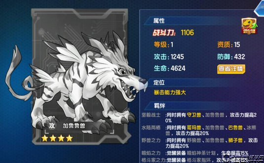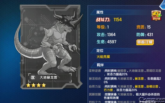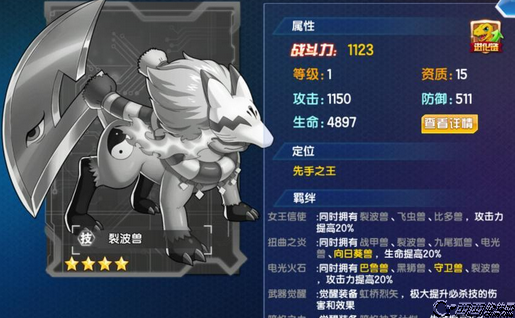 分析:首抽十连可以获得的4星数码兽里为数不多的在后期依然强力的数码兽,爆炸性输出,同时也是之后会开启的数码争霸活动中的强力数码兽~