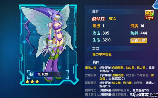 分析:虽然是3星数码兽,可她却是数码争霸活动毫无争议的必备数码兽,甚至有的限时16资质数码兽在争霸中也要被她虐~
