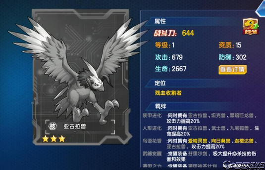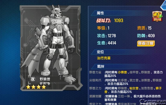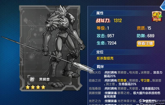 分析:虽然和冰熊兽并列为首抽十连中最渣的存在,但目前抽奖可以获得且后期有用的数码兽本就不多,好歹是4星,前期在争霸中也有不俗的能力~