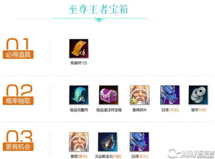 该礼包必出炼器符*25,有几率开出“普德”整卡、九级宝石、永久白泽等高级道具!