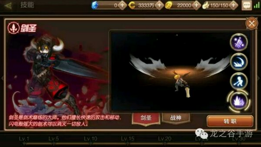 战士在15级转职可选择转成剑圣职业,剑圣是剑术磨砺的大师,他们擅长快速的攻击和移动,闪电般强大的剑术可以消灭一切敌人。