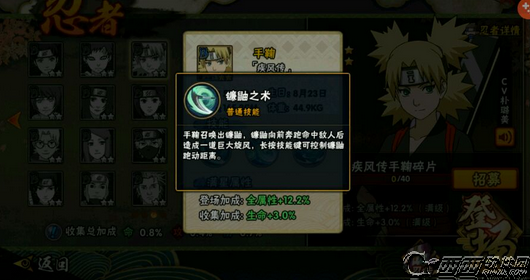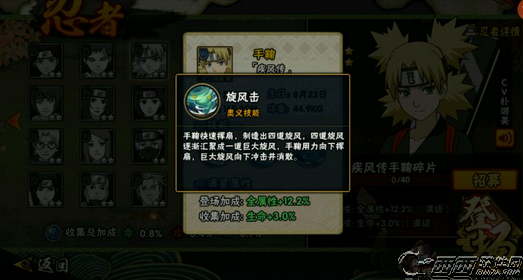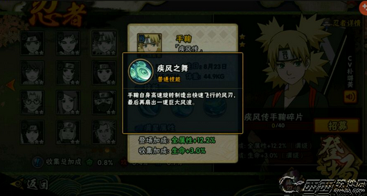 火影忍者手游疾风传手鞠登场,可以通过生存挑战兑换碎片进行合成,那么疾风手鞠怎么用,疾风手鞠有什么技能,下面就和西西来看看疾风手鞠技能介绍,希望大家喜欢。