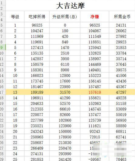 大吉达摩可通过升级来获得更多的经验,但是大吉达摩升级也需要不少金币,通过以上的大吉达摩升级经验及花费汇总表,可以看到大吉达摩在13或者14级吃掉,经验和金币花费算是比较均衡的。