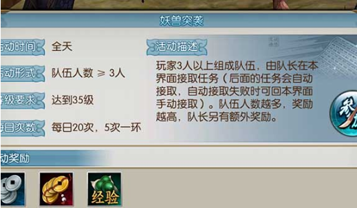 (1)玩家组队后由队长在活动界面接取任务,并由队长带领去往队伍等级对应的场景寻找NPC,对话后满足条件的队伍进入相位战斗,完成任务后结算奖励,接取下一个任务。