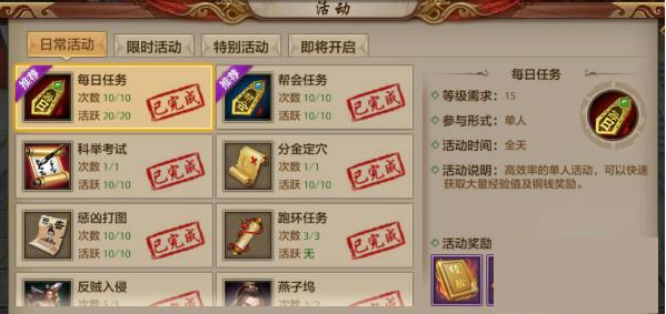 每日的日常活动都要一个不漏的全部参加。比如,夺宝马贼,帮会任务,每日任务,科举考试等等。还包含了所有可以参加的副本。尽量和结拜的小伙伴们一起完成,可以获得组队经验的加成哦。每日任务中可以参加的活动全部要参加。