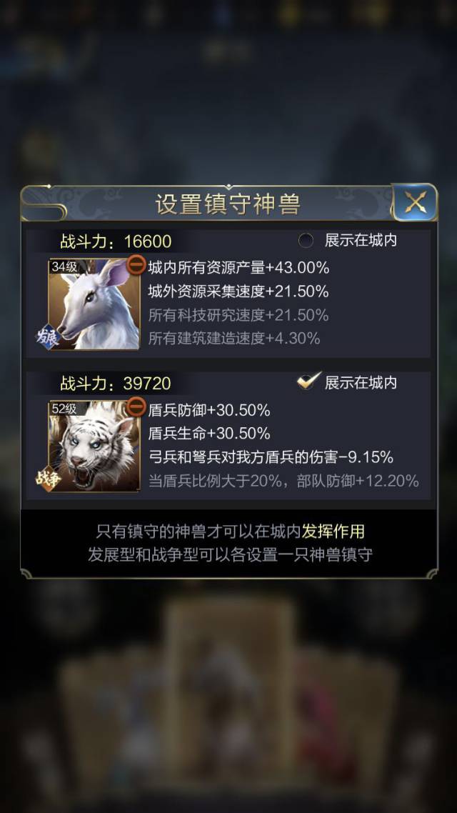 8、神兽可以选择两只进行镇守,一只发展型,一只战争型,注意,只有镇守的神兽才可以为城内增加属性!