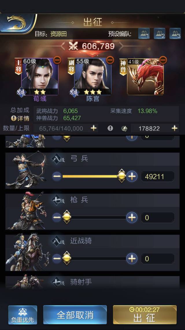 9、每只出征部队可以选择一只神兽出征,为出征部队增加属性,只有战争型的神兽才能出征。