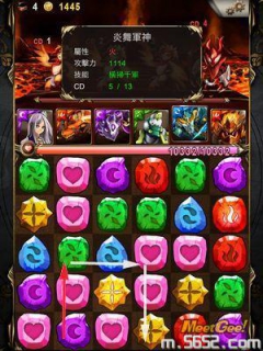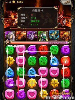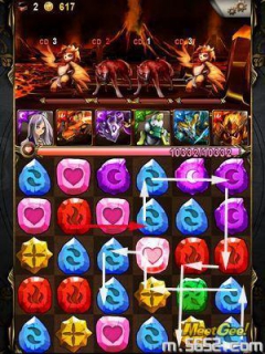 转珠的时候最怕转到角落去,要想转出来的话,一个不小心又会破坏刚摆好的五连珠。时间在进退两难的犹豫中耗尽,最终可能只有尴尬的1combo,白白浪费一回合。这里小编教大家一种s型转法,如图一的路径所示,火珠只要按照路线的方法挪一圈就能从右边出去了。刚好旁边就有集中的火珠,像图二那样绕个圆圈就凑出了两组全体攻击。而且图中的boss拥有强化盾,刚好需要五连珠产生的强化石才能造成伤害,这次转珠是相当成功的。