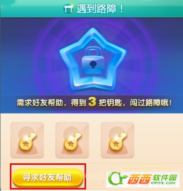 进入第15关后点击“路障”,游戏系统弹窗提示“需要好友帮助,得到3把钥匙,闯过路障哦。”这时候点击“寻求好友帮助”按键,或者你直接花费60颗钻石也是可以解除路障的,如果你钻石多的话。