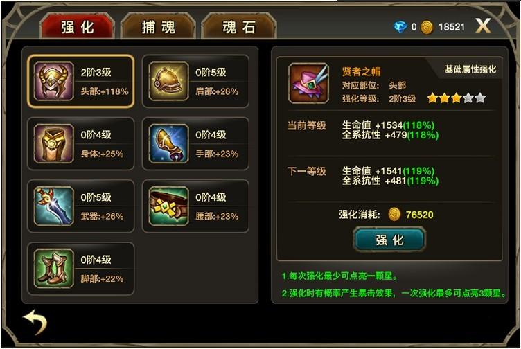 每次强化至少可以获得一颗星,在强化的过程中会有一定几率出现“强化暴击”,每当暴击一次则可以提升2-3星,当获得5颗星后魂器则将提升一级,提升满10级后则自动提升1阶。