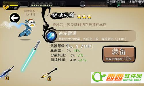 这就是忍者必须死2绝地光剑的获取方法,当然除了充值1元获得,玩家也可以直接通过1280购买(10级解锁),不过小编并不推荐用勾玉购买,太不划算了,还是充值1元比较划算,因为后期勾玉非常不够用。
