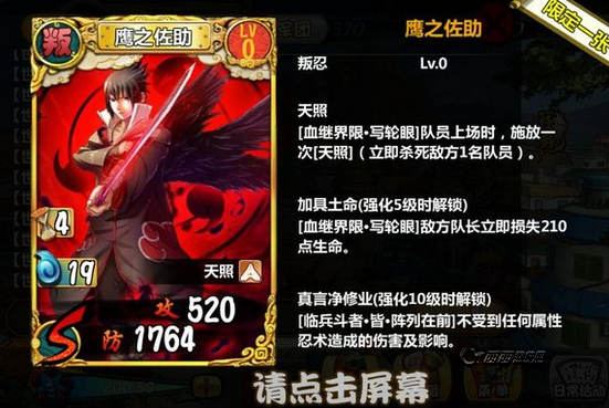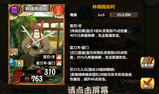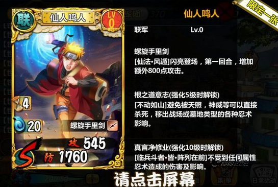 当你进入这个光怪陆离的天天忍者世界,刷完第一大关,微博分享以后就会有一张幸运卡,你可别小看它,它绝对是你以后玩这个游戏追逐的对象,因为你可以用它抽卡,第一次抽卡必送一个a级卡,第一张A级经过游戏测试就是一张牛,一个樊一个卡卡西和一个君麻吕。