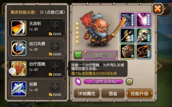 三技能,治疗图腾。满级能够恢复2560、图腾为无敌状态,不会被打掉。这个技能给予了剑圣一定的恢复能力。改版后的治疗图腾好像多了一个血量判定。本来是的攻击循环应该是开场剑刃风暴--图腾--平A四下--剑刃风暴-图腾这样的设定。但是,在我过图的时候意外发现,平A4下的时候竟然会穿插图腾,具体触发条件不明。