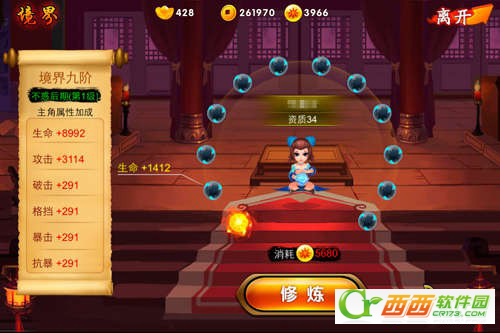 在赛场上,经常会听到一个词”无冕之王“,这些人在粉丝的心目中同样有着十分重要的地位,多半因为其与实力相当的人品。修养是一个人的魅力所在,捉妖人士也不可或缺,在《囧西游》中称之为境界。境界的提升可以为主角的生命、攻击、破击等属性加成。境界阶层的提升需要消耗境界点,玩家可通过主城每日俸禄领取、征收、试炼场、竞技场挑战等多种方式获取。