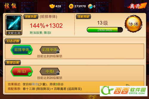 在《囧西游》中,玩家可选择的职业目前暂有方士、剑使两种,所释放的技能各不相同。方士是法术的修道者,具备强大的攻击力,其技能”灵蛇出洞“可随机打击前排单个敌人;剑使是剑的驾驭者,拥有结实和灵巧的身躯,”昆仑刀法“亦是令妖怪闻风丧胆。但冰冻三尺非一日之寒,玩家需消耗功力修炼,不断提高技能的等级。当技能达到一定等级后,打击范围将从前排扩张至后排,附加效果也将增加。技能升级所需的功力可通过试炼场挑战或拜神获取。
