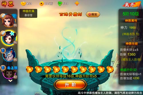 众所周知,《西游记》中的各路神仙都有属于自己的神器。比如孙悟空的金箍棒、猪八戒的九齿钉耙、沙悟净的降魔月牙铲等。在《囧西游》中,这并非主角的特权,伙伴同样可以拥有专属的酷炫神器。在战斗过程中,神器将增加主人的防御能力,满怒气还可发动神力攻击。获得神器后,玩家可对伙伴的神器进行升级,满级后可升阶,从而加强伙伴的战力。而升级所需的器魂可通过农场种植、熔炼多余装备或聚魂等途径获取;升阶则需要神器进阶符加持。