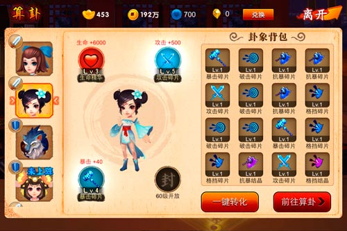 古人常说:天时、地利、人和,卦象一说便是对这一观点的最佳诠释,外界任何微小的变化都有可能产生巨大的影响。《囧西游》中的算卦系统汲取了博大精深的卦象文化,助玩家及伙伴在取经路上顺利前行。游戏中,随着角色等级的提升,卦象位置将逐渐开放。玩家可选择让百晓生、黄半仙、张天师等卜上一卦,而后从卦象背包中选择任意卦象碎片进行装备,即可增强生命、格挡、抗暴、破击等属性,从而提升伙伴战力。