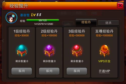 除战力之外,经验的提升也是刻不容缓。经验丹的服用是伙伴的特权,可快速提升其经验值。经验丹有等级之分,等级越高可获得的经验就越多,可通过日常副本闯关获取,而VIP玩家还可拥有至尊经验丹,其威力可想而知。